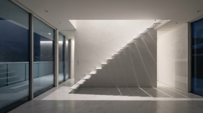 空間の中心に配置された階段は、もはや階層を繋ぐための道具ではありません。それは、空間を切り裂き、あるいは繋ぎ止める「彫刻」として存在します。蹴込み板を排し、極限まで薄く仕上げられた踏板が、白い壁体からキャンチレバー(片持ち梁)で突き出す様は、重力という物理的制約から解放されたかのような錯覚を与えます。